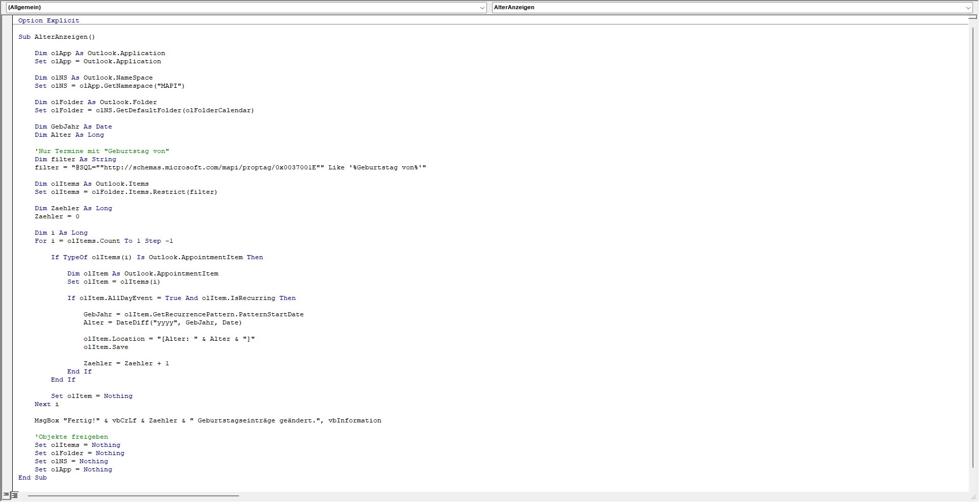 Wir haben eine Lösung für Sie gefunden, die das Alter direkt im Kalender neben dem Geburtstag anzeigt. Es handelt sich bei der Lösung um ein Stückchen Programmierung, einen VBA-Code, den aber auch ein Laie problemlos in sein Outlook einfügen kann.