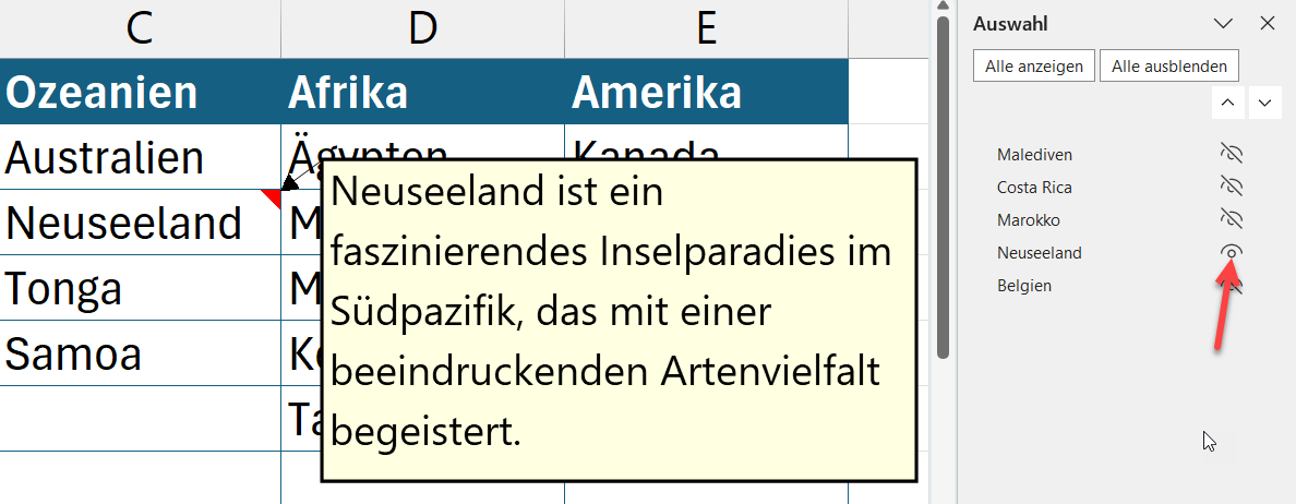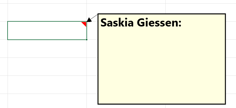 Um die Notiz temporär anzuzeigen, klicke auf den Namen im Auswahlbereich. Die entspreche Notiz wird eingeblendet. Sie bleibt so lange sichtbar, bis du in eine Zelle oder auf einen anderen Notiznamen klickst.