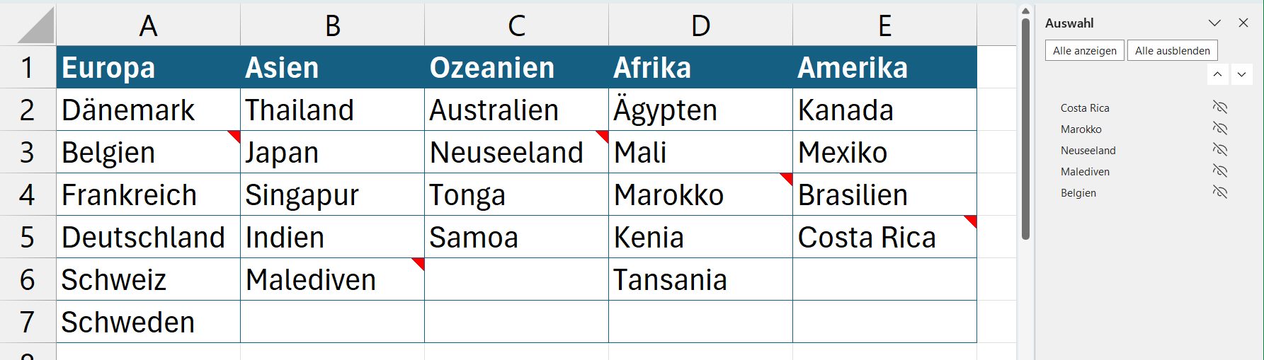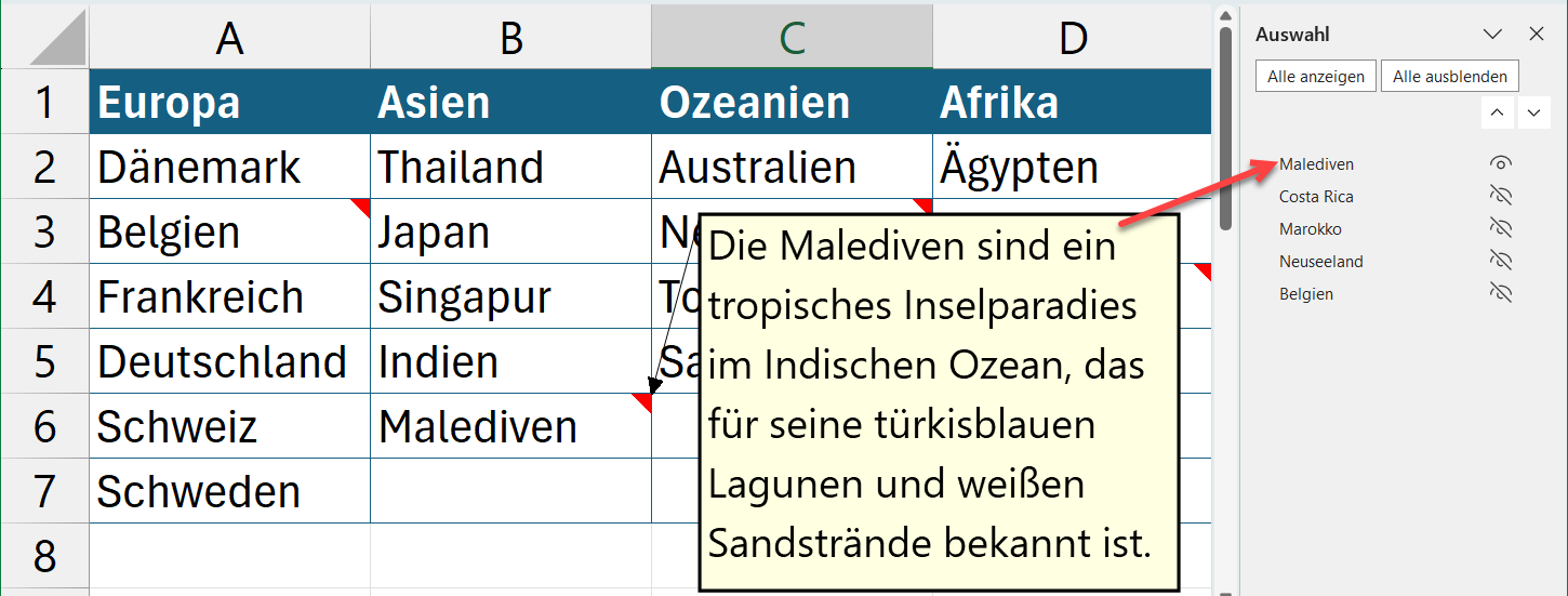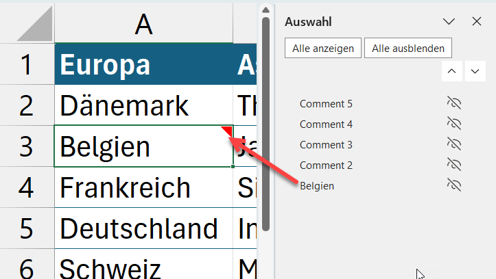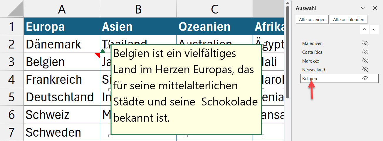 Du kannst den Namen Comment ganz einfach ändern. Klicke einmal im Auswahlbereich auf den Comment-Eintrag, dessen Name du ändern möchtest. Im Tabellenblatt wird diese Notiz angezeigt. Klicke noch einmal im Auswahlbereich auf die Notiz. Jetzt steht der Cursor im Feld und du kannst den Namen erfassen. Z. B. die Zelladresse A3 oder wie in dieser Abbildung den Inhalt der Zelle „Belgien“.