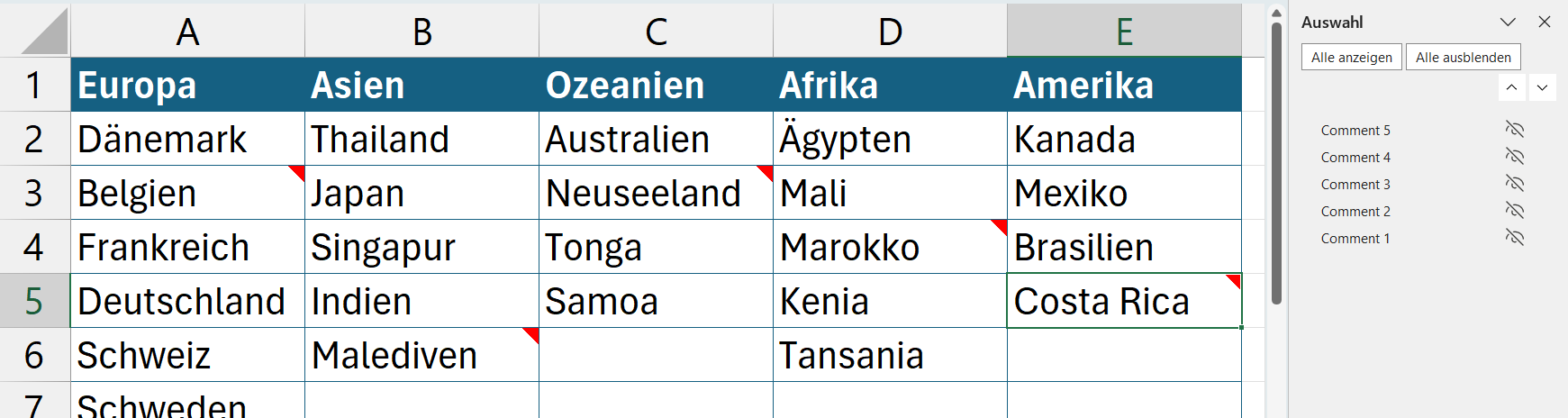 Aktiviere die Registerkarte Start und klicke auf die Schaltfläche Suchen & Auswählen. Starte den Befehl Auswahlbereich. Der Auswahlbereich öffnet am rechten Fensterrand. Die Reihenfolge der Notizen entsprechend der Reihenfolge, in der sie eingefügt wurden. Comment 1 wurde als erster, Comment 2 als zweiter usw. eingefügt.