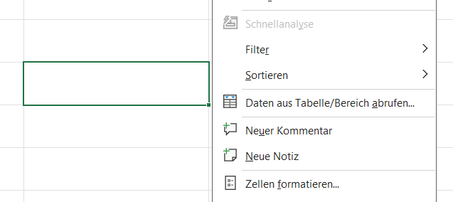 Um eine neue Notiz anzulegen, klicke mit der rechten Maustaste in die Zelle, in die du eine Notiz einfügen möchtest. Wähle den Eintrag Neue Notiz. Dabei kann die Zelle leer sein oder bereits einen Inhalt besitzen.