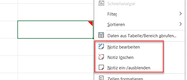 Im Kontextmenü der rechten Maustaste findest du alle Befehle, um eine Notiz dauerhaft anzuzeigen, zu bearbeiten oder zu löschen. Diese Befehle findest du auch auf der Registerkarte Überprüfen an der Schaltfläche Notizen.