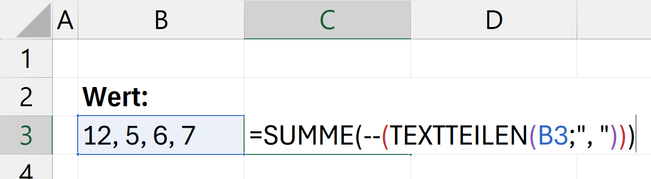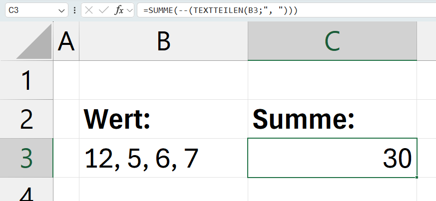 Die Funktion TEXTTEILEN() trennt Zellinhalte. Du gibst im zweiten Parameter an, welches Trennzeichen in der Zelle verwendet wird. In diesem Beispiel sind es ein Komma, gefolgt von einem Leerzeichen. Das Ergebnis sind die in der Zelle B3 stehenden Zahlen allerdings als Text.