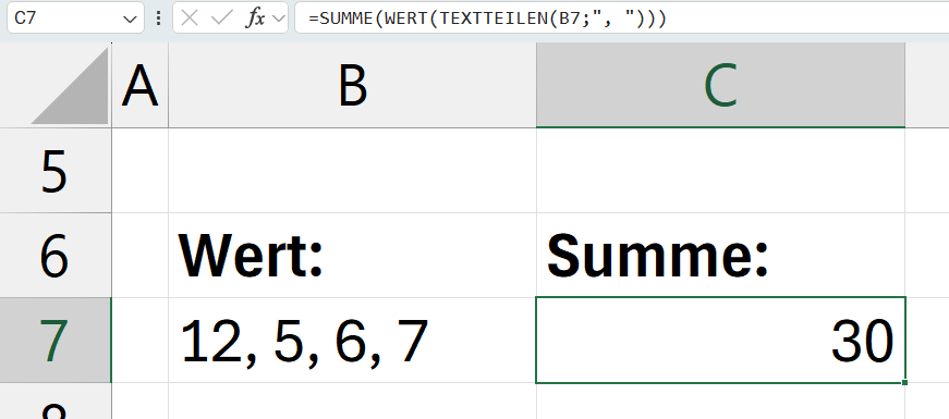 =SUMME(WERT(TEXTTEILEN(B7;", ")))