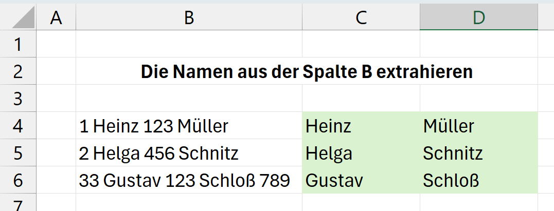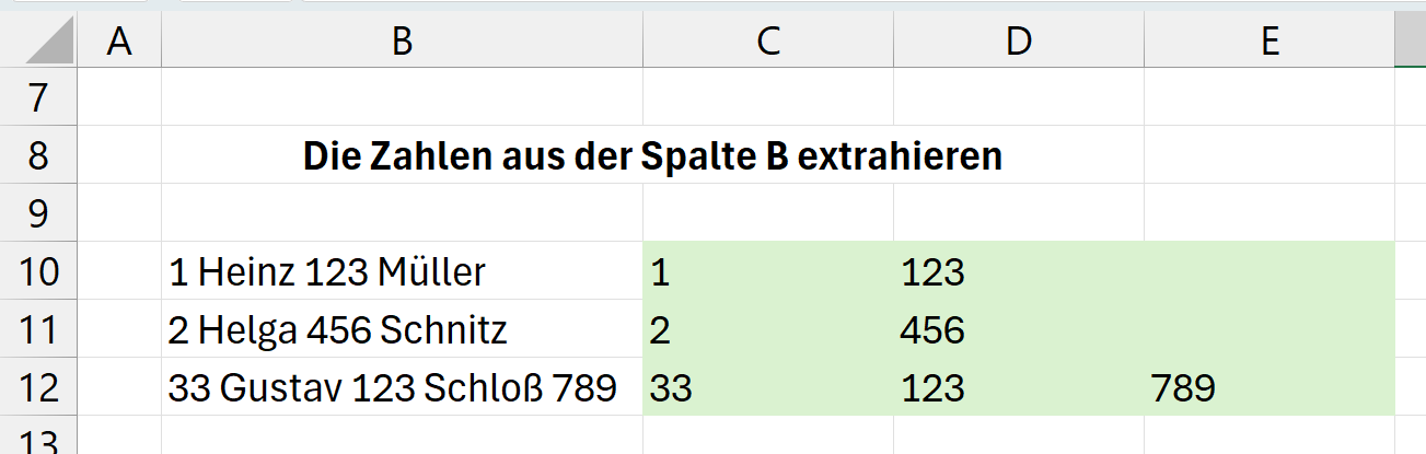 Die folgende Abbildung zeigt das Ziel: Diesmal wurden nur die Zahlen aus den Zellen der Spalte B extrahiert.