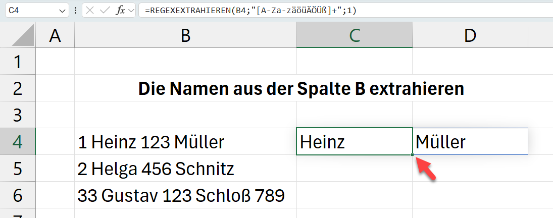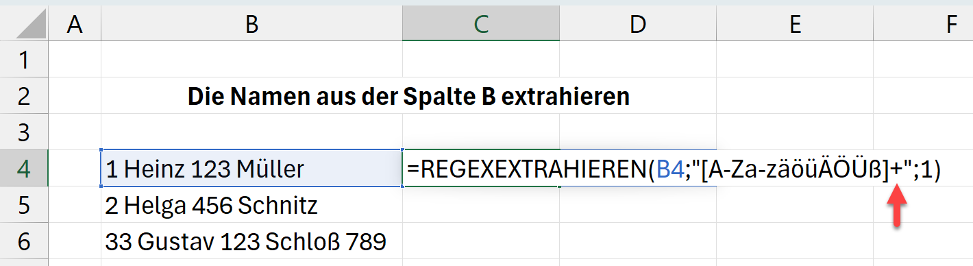 Die Funktion REGEXEXTRAHIEREN kann Muster in Texten erkennen. In der eckigen Klammer gibst du die Buchstaben (Muster) ein, die du extrahieren möchtest. [A-Za-zäöüÄÖÜß] weist die Funktion an, alle lateinischen Buchstaben inklusive deutscher Umlaute und ß zu extrahieren. Beachte, dass du die Daten in Anführungszeichen setzt.